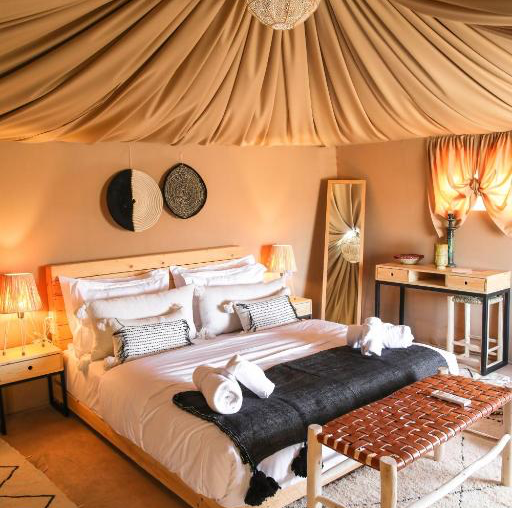 As the night draws to a close, retreat to your private tent, adorned with traditional Moroccan furnishings and comfortable bedding. Fall asleep to the peacefulness of the desert, with the gentle sound of the wind whispering through the tent. Wake up to the soft hues of the sunrise, as the desert slowly awakens to another day.