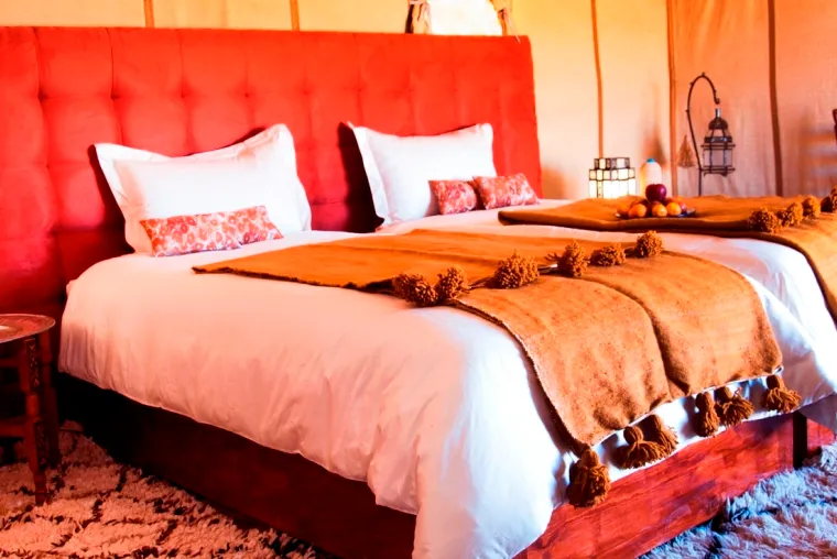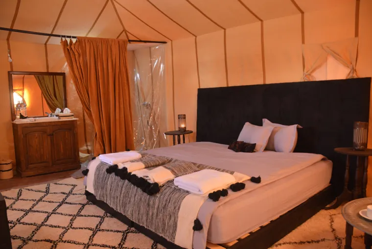 You will spend your nights in the most amazing and exclusive luxury desert camp in Erg Chebbi dunes. Your luxurious private tent will make you travel deeper in Moroccan and Berber culture. Your tent is a perfect combining between luxury and authenticity reflecting the Berber culture and heritage. You will have toilets and hot water shower inside your tent.